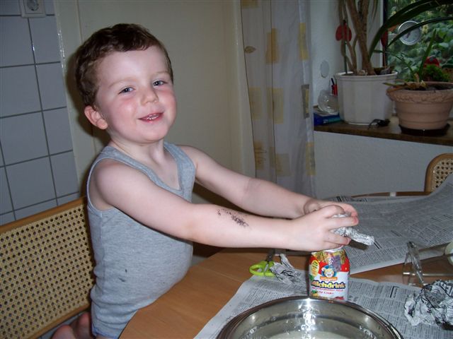 Los geht´s - Kleister ist ja nicht nur zum Kleben von Pappmaché, sondern eignet sich hervorragend, um "Teig zu machen, Mami"